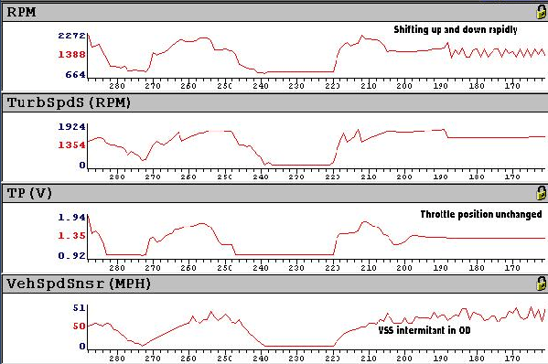 Here goes the story of a successful and minor repair for a 1996 Explorer. It may be a little complicated unless you're used to monitoring graphs and scopes. But give it a shot! The complaint was rapid upshifts and downshifts around 45 MPH (shift shuttle).