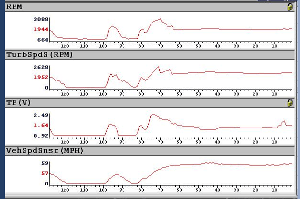 Picture 4: Looking at bottom graph. The speedometer drive gear was replaced and now there is a smooth signal for the computer to monitor. Compare this bottom chart to the chart at the top of this demo, (paying attention to right side). You will see the big difference, as it shows a smooth VSS with no glitching!
